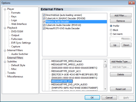 Remember that DTS audio bitstreams don’t require the ffdshow treatment. To avoid having to reconfigure this for different movie formats we can customize the recognized media types for the ffdshow filter. As per the screenshot above, select ffdshow Audio Decoder then scroll down until you find MEDIASUBTYPE_DTS and delete it. DTS files will now skip ffdshow and will be entirely handled by CyberLink Audio Decoder. If you ever need to revert this change click Reset List.