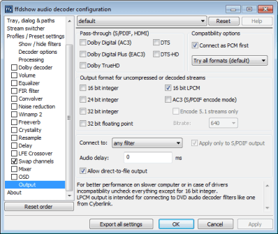 Would you believe it, there is yet another hitch – the CyberLink Audio Decoder expects LPCM input channels to be in a certain order, one that differs from the default order in ffdshow. This is trivial to fix, though it will mess things up if you rely on ffdshow to decode other media formats.