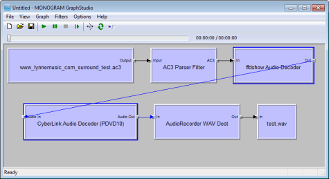 The key to understanding this is knowing how the modular Windows DirectShow media layer works. If you’ve already played with MPC-HC you will be familiar with adding and removing filters, as well as the concepts of ones that are built into MPC-HC and those that are external. All these DirectShow filters have ‘pins’ which are their inputs and outputs – their connection points in other words. Each pin has a defined list of media types it will and won’t accept. As long as you comply with this, they can be threaded together to create a ‘graph’. The simplest way to illustrate this is with a screenshot of the aptly named GraphStudio, and this example shows the combination of filters I used to make one of the sample audio clips earlier in this post: